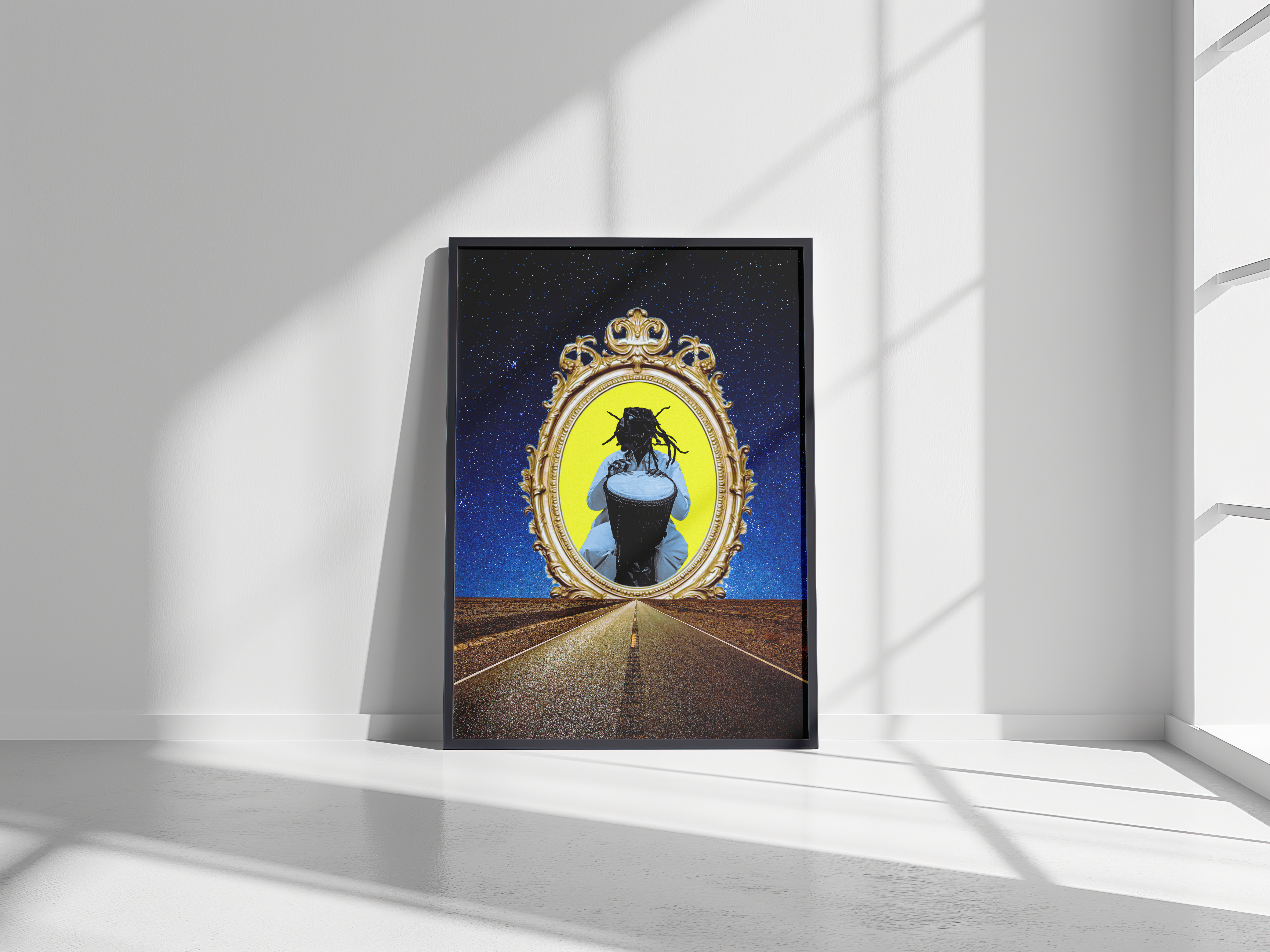 “Reflections of the Journey”, a bold visual narrative symbolizing self-reflection, ambition, and the limitless road ahead. The fusion of classic elegance with a futuristic backdrop makes this piece perfect for modern spaces that inspire ambition and creative thinking.